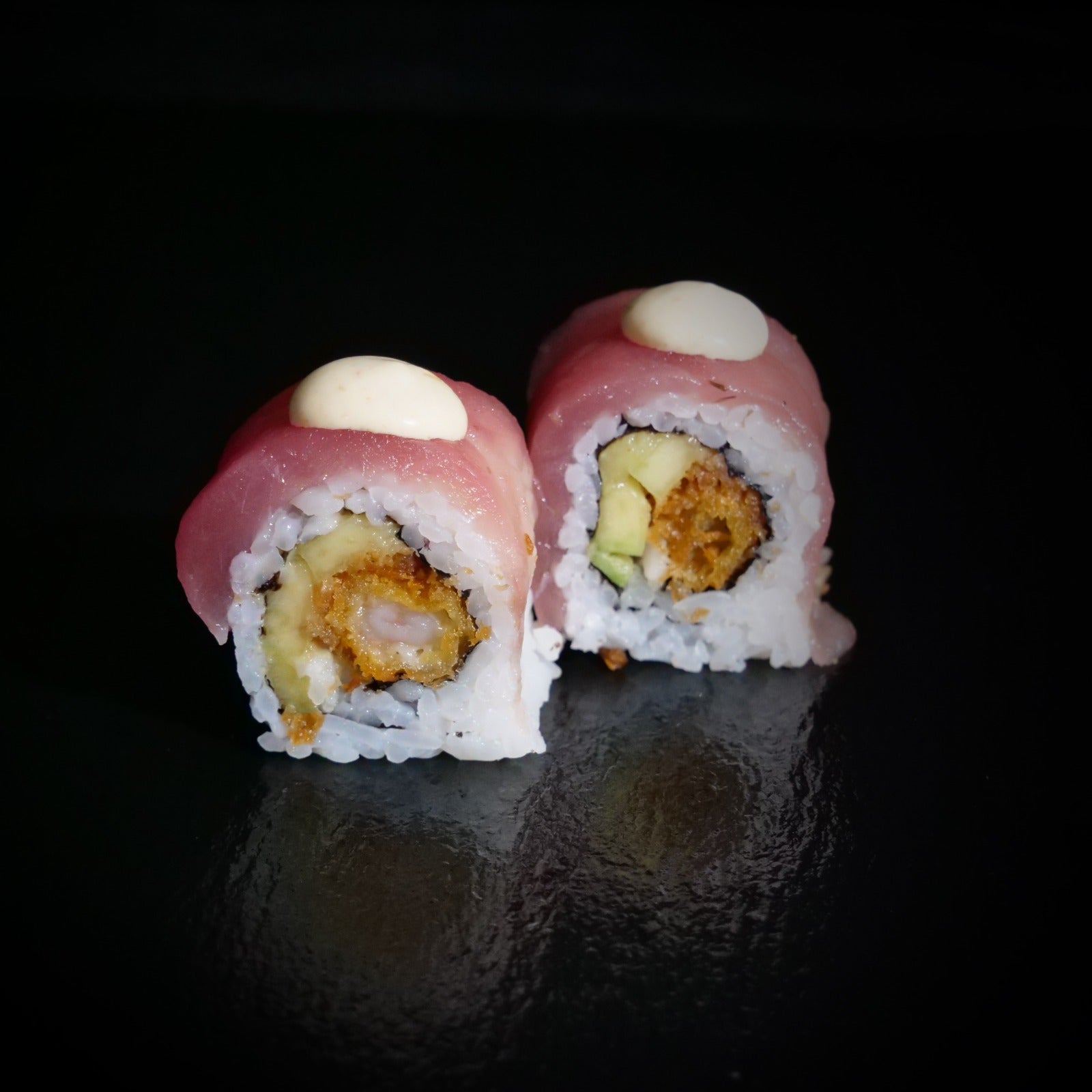 Tempura-Garnelen, Mango; on top Togarashi-Hollandaise.